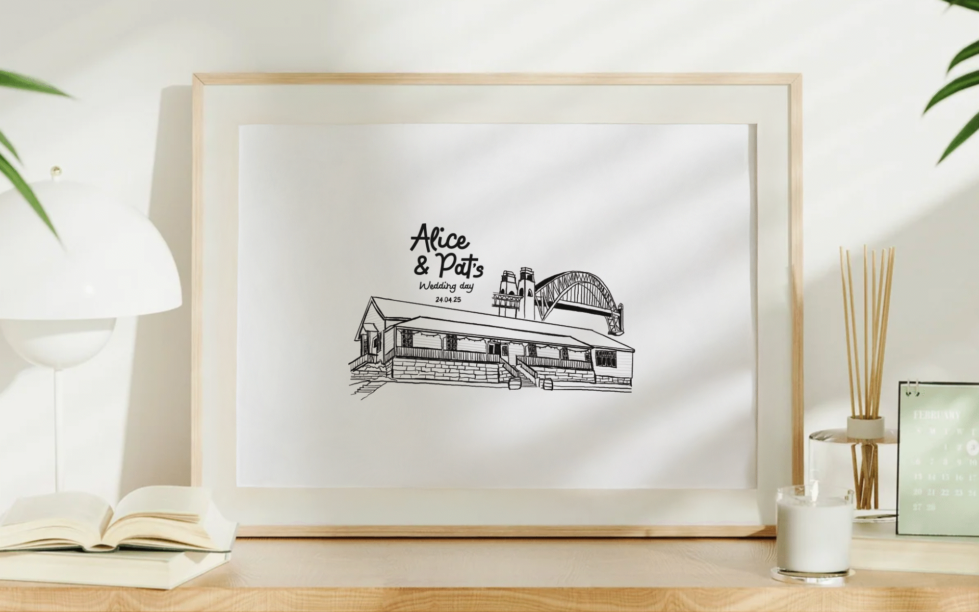 This could be your wedding venue, first home, a restaurant, that one special spot—and your guests leave their messages around it. Or if you are just looking for the illustration without the signing element.